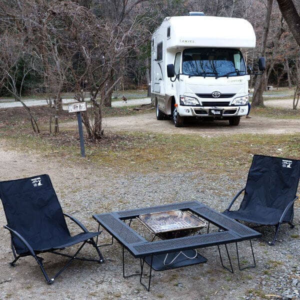 焚火台、焚火テーブル、ローチェア(2脚)のセット。